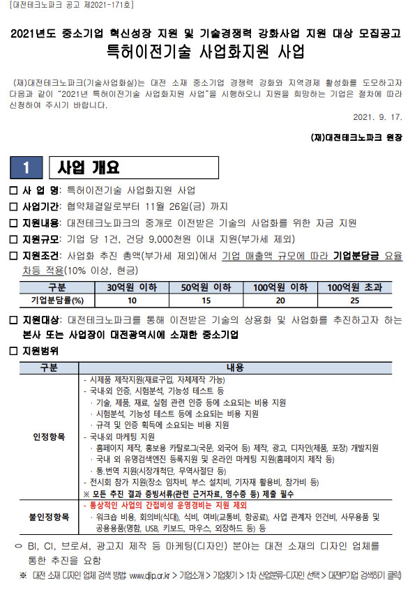 (대전) 2021년 중소기업 혁신성장 지원 및 기술경쟁력 향상사업(특허기술이전 지원사업) 모집 공고
