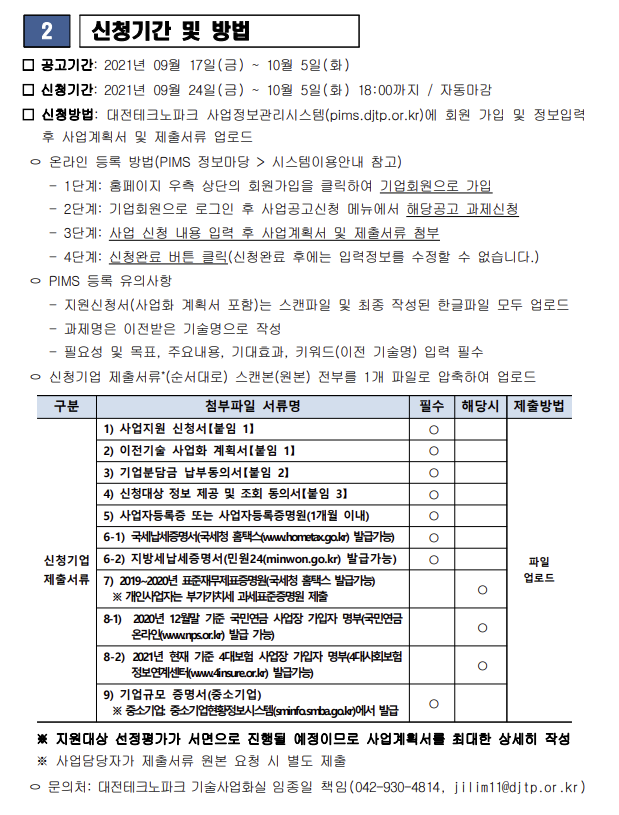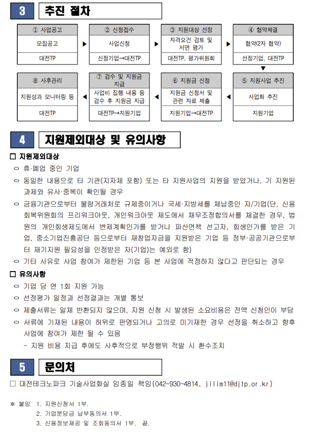 대전지역 중소기업의 경쟁력 강화와 지역경제 발전을 위해 시제품화, 시험분석, 국내외 마케팅 등을 지원하는 사업입니다. ☞ 대전광역시 소재 중소기업 ☞ 1 기업별 900만원 이내 지원 지원분야 및 대상 ㅇ 지원대상 : 대전광역시에 본사 또는 사업소가 있는 중소기업 사업화 및 사업화 ㅇ 사업기간 : 계약 체결일부터 11월 26일(금)까지 조건 : 회사 전체 매출(VAT 별도) 중 매출(VAT 별도) 기준 회사별 1개, 별도 적용 회사 기여율(10% 이상, 현금), up 건당 최대 9,000,000원(VAT별도) ㅇ 지원내용 : 대전사이언스파크를 통한 기술이전을 위한 사업화 자금 ㅇ 지원범위 – 인증사업 지원 시제품 제작(자재구매, 자체제작) ㆍ국내외 인증, 시험분석, 기능시험 등 *기술, 제품, 재료, 실험 등 관련 인증에 필요한 비용 지원 *시험분석, 기능시험 등에 필요한 비용 국내외 마케팅 지원* 홈페이지 제작, 홍보 카탈로그(국문, 외국어 등) 제작, 광고, 디자인(상품, 패키징) 개발 지원* 국내외 유명 검색엔진 등록 지원 및 온라인 마케팅 지원(홈페이지 제작 등) ‧ 통번역 지원(마켓 개발사절단, 무역사절단 등) – 참가업체 지원 (행사장 임대료, 부스설치비, 장비사용료, 전시비 등) *지원에 따른 간접운영비 제외* 워크샵비, 회의비(식비), 식비 , 출장비(교통비, 항공권), 협력업체 인건비, 사무용품 및 공용물품(명함, USB, 키보드, 마우스, 외장하드 등) ※ BI, CI, 브로슈어, 전단지 제작 등 마케팅(디자인) 분야는 대전시 디자인회사 지원방법 및 서류 ㅇ 지원방법 : 온라인 지원 – 대전과학단지 사업정보관리시스템(pims.djtp.or.kr) ㅇ 제출서류 : 지원서 등 ※ 대전사이언스 방문 박 세부사항 홈페이지(☞바로가기) 참고 ㅇ대전기술단지 기술사업화사업소 – 전화: 042-930-4814, 이메일: [email protected] 공지사항(특허기술이전지원사업).pdf