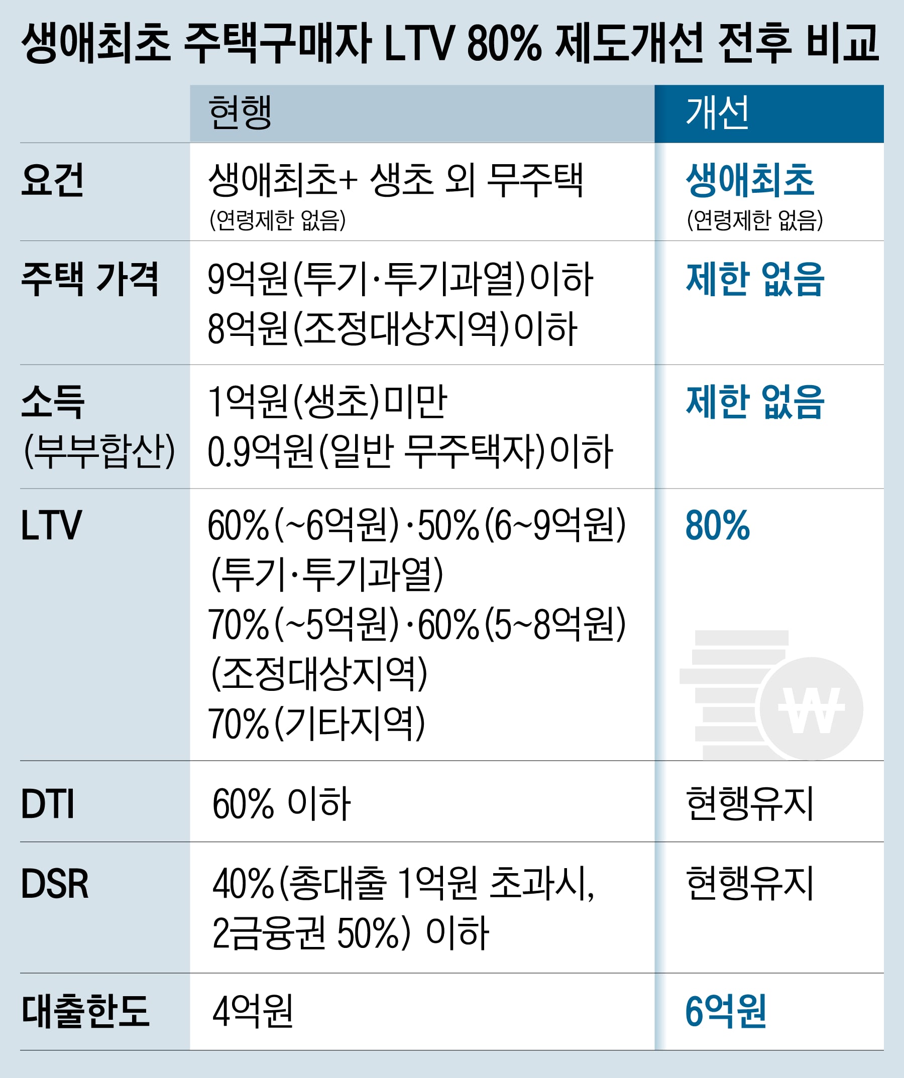 기본적으로 대출 한도는 최대 3억원이다. 다만 미혼 신청자의 경우 한도가 조금 낮아 최대 2억5000만원까지만 받을 수 있고, 신혼부부나 2자녀 이상 가구는 최대 4억원까지 받을 수 있다. 또한, DTI(총부채상환비율)가 60% 이내, LTV를 충족해야 합니다. (주택 대출 비율)은 첫 주택 구입자의 경우 최대 80%까지 가능합니다.